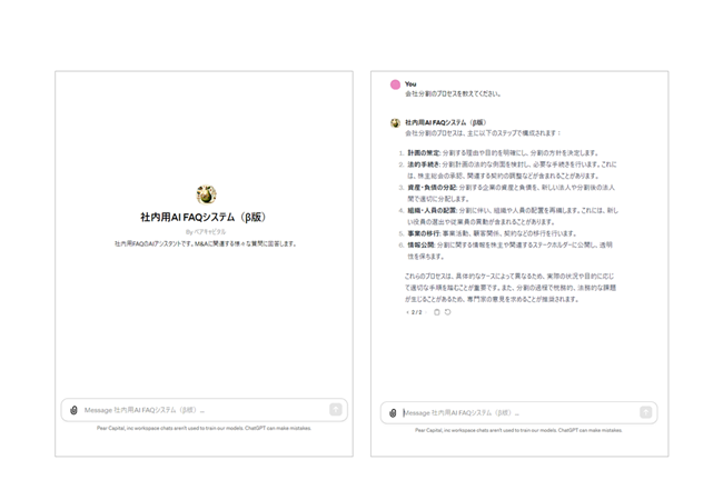 OpenAI社が提供する「GPTs」( https://openai.com/blog/introducing-gpts )を用いた、従業員からのM&Aに関連する疑問点や業務上の不明点に対して自動で応答する社内向けシステム