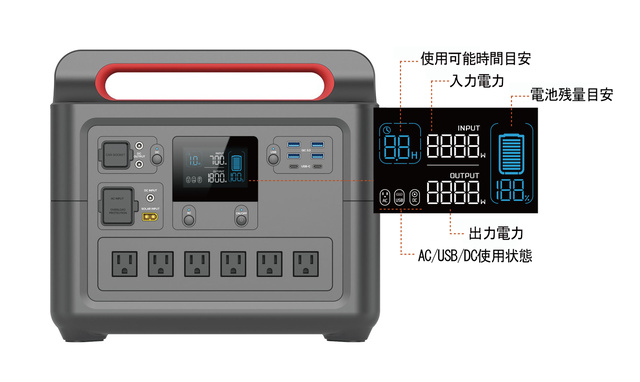 本体正面の大型液晶ディスプレイでは、入・出力数値表示、フル充電までの残り時間表示、バッテリー残量のインジケーター&パーセント表示など、充電/給電時の様々な情報が確認できます。バッテリー状態が常に分かるので、計画的な利用が可能となり、安心してお使いいただけます。