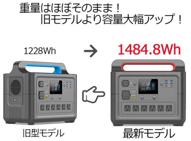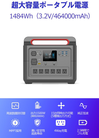 ・特徴1:驚きの1484Wh(3.2V/464000mAh) 超大容量ポータブル電源