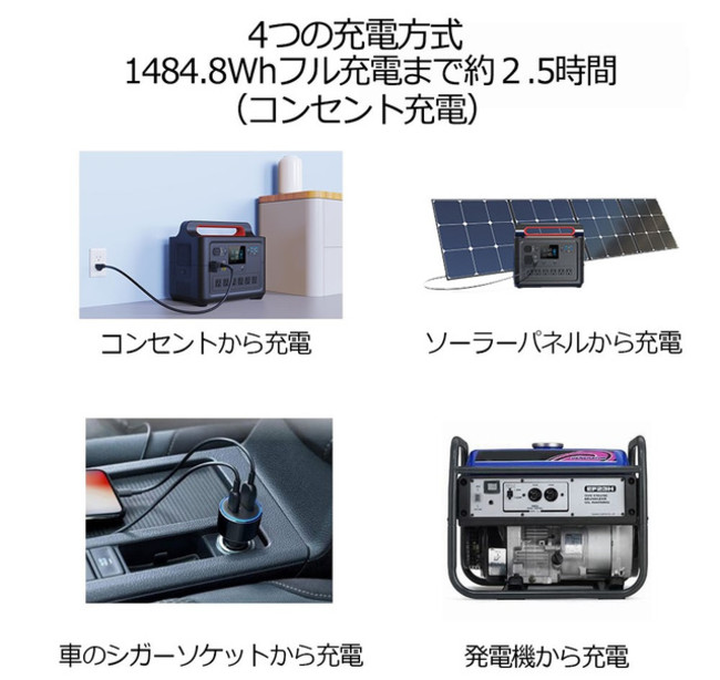 4つの充電方式(コンセント・ソーラーパネル・シガーソケット・発電機)を備え、コンセントからは約2時間30分でフル充電が可能。出力口は汎用性の高いDC製品(USB2.0・QC3.0・Type-C )ほぼ全てに対応し、AC出力口は100V6個を設けていて合計15のデバイスの同時利用が可能です。