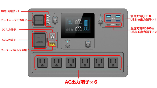 出力 :AC出力 ×6ポート(完全純正弦波) 1500W瞬間最大出力2000W/1秒間