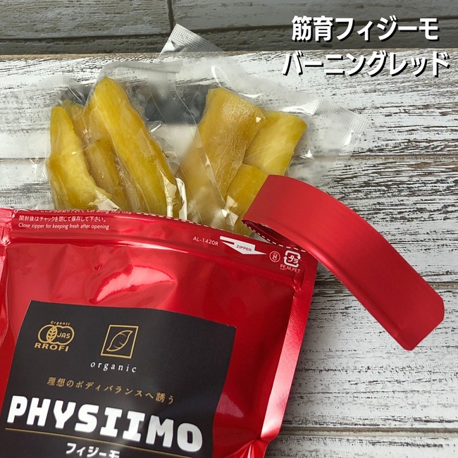 フィジークへの愛(I)とオーガニック干し芋への愛(I)を重ねて、フィジーク専用干し芋「PHYSIIMO(フィジーモ)」と命名しました。また、〜PHYSICAL IMPROVEMENT MOTIVATION〜肉体を鍛えぬく日々、傍にいつもフィジーモを置いて、癒し・やさしさといった温もりも感じていただき、心のエネルギーにしていただきたいという想いも込められています。トレーニーをやる気にさせる、攻めのデザインを採用しました。
