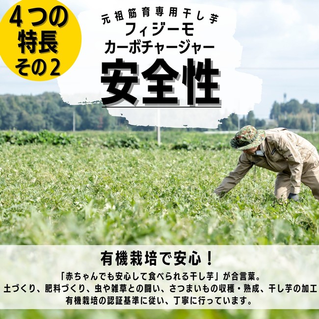 土づくりから、除草、施肥、加工、袋詰めまで、国の有機栽培・加工基準に従って行い、全行程自社管理の栃木産有機干し芋を使用しています。オーガニック認証取得済です。