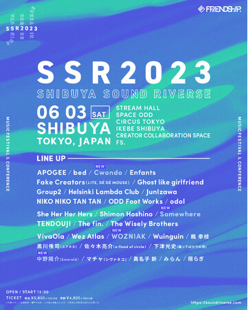 HIP LAND MUSICによる音楽ディストリビューションサービス「FRIENDSHIP.」が、渋谷川周辺エリアから新しい音楽やインタラクティブ、テクノロジーを通じたカルチャーを世界へ発信するためのイベントとして、2022年よりスタートした渋谷サーキットイベント”SHIBUYA SOUND RIVERSE (略称: SSR)”の2回目となる『SHIBUYA SOUND RIVERSE 2023』の全出演アーティストとタイムテーブルがアナウンスされた。