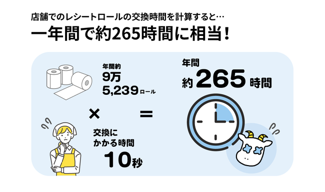 さらにロール数換算値(約9万5,239ロール)に、店舗でのレシートロール交換時間(1ロール平均10秒)を掛け合わせると、総時間約265時間となりました。コスト同様、店舗側における交換の手間は、人件費にも大きく影響していることがわかります。