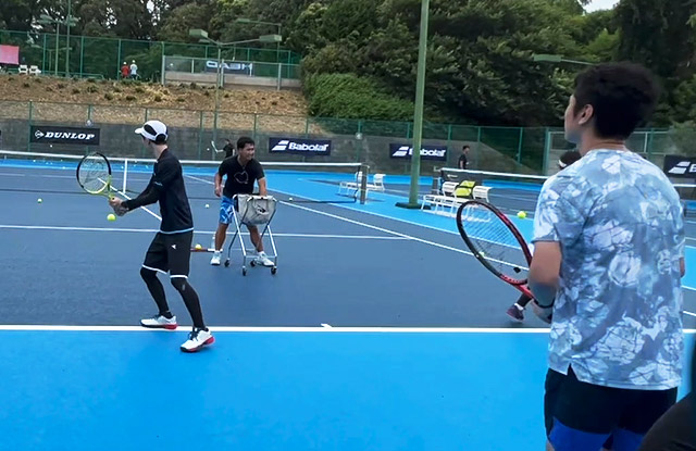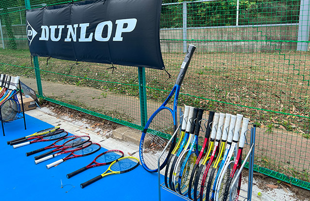 ダンロップのコートでは、「FXシリーズ」をはじめ、「SXシリーズ」「CXシリーズ」「LXシリーズ」のテニスラケットの試打と、K・SWISS(ケースイス)のテニスシューズ「Express Light 3」「Bigshot Light 4 Omni」シリーズの試履きが行えました。