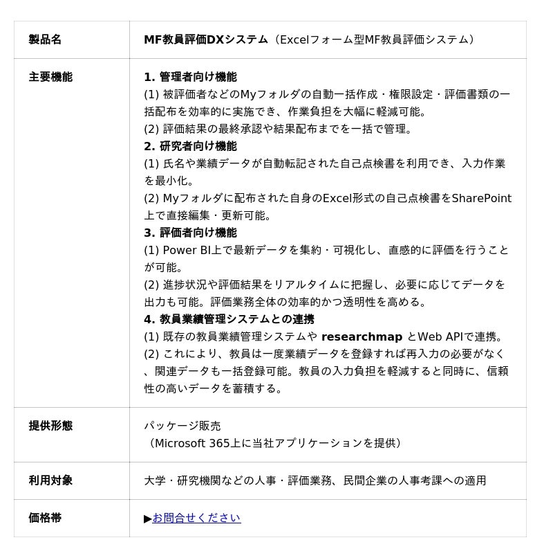 Microsoft 365で構築した業務システムの典型例として「MF教員評価DXシステム」をご紹介します。製品の詳細は以下をご覧ください。