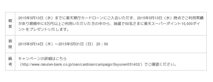 楽天銀行株式会社(本社:東京都品川区、代表取締役社長:永井 啓之、以下 「楽天銀行」)は、2015年5月4日(月)をもちまして誕生5周年を迎えました。これを記念いたしまして、本日5月14日(木)より、カードローンおよび住宅ローンについて、以下のキャンペーンを実施いたします。