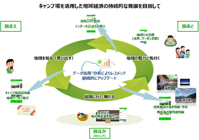 スマートストアでの特産品取り扱いを始め、スマートフォンアプリを活用したキャンプ場周辺地域の施設・観光地への誘客、キャンプ場利用者への特典付与など、消費を促進し地域経済圏の活性化を図る仕組みづくりを検討します。