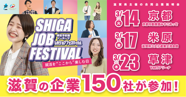 昨年満足度93%※!「ノースーツ・ノー作業着」の合同企業説明会「しがジョブフェスティバル」が3月14日・17日・23日に開催。滋賀の優良企業150社が参加し、就活解禁に合わせてコロナ禍の新卒採用を開始