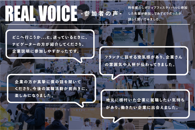 「しがジョブフェスティバル」とは、本来なかなか気が乗らない合同説明会への参加を機に、就職活動を“ここから”楽しめる1日にできるよう、企業も学生も「ノースーツ・ノー作業着」で参加する合同企業説明会です。昨年も開催された本イベントには、延べ560名以上が参加、アンケートでは84%以上が「満足」と回答し、非常にご好評いただいたイベントとなっています。