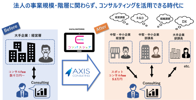 アクシスコンサルティング株式会社(本社:東京都千代田区/代表取締役社長:山尾 幸弘、以下「アクシスコンサルティング」)は、企業の経営や事業における課題を、1回5.5万円(税込)でコンサルタントに相談できるスポットコンサルサービス『コンパスシェア』を2022年7月27日(水)から提供いたします。
