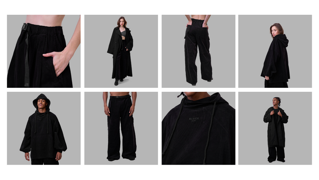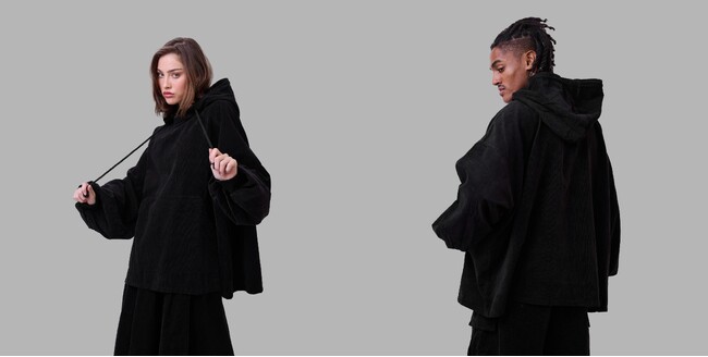 家でも外でも着心地が良いように、柔らかい薄手のコーデュロイ生地を選びました。首元も立つように作っており、ハイネックになっています。全体的に、下に行くほど広がるように作りました。オーバーサイズなので様々な体型の方も、バランス良く似合うかと思います。女性は大きめのサイズを選ぶとワンピース風にもなります。胸元はBLVCK PARISのロゴを刺繍しています。洗うほど味も出てきます。