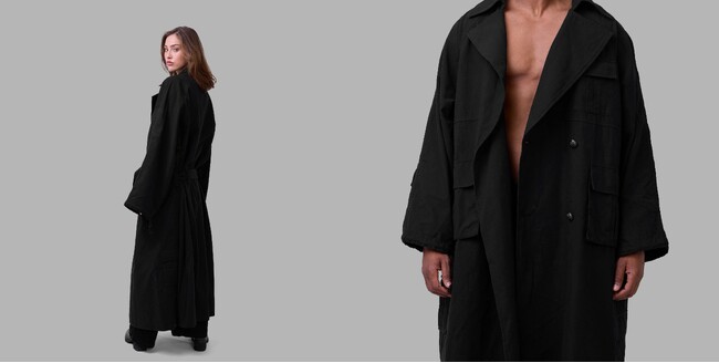 かなりオーバーサイズで、フォーマルだけではなく、ストリートファッションでも合うように作りました。ボタンの部分がBLVCK PARISらしくヘビ柄になっています。袖の裾しぼり部分もロープにしてカジュアル感を出しています。ベルトの腰位置やポケット位置も低くしており、羽織るだけで様になります。裏地もBLVCK PARISの総柄がふんだんにあしらわれています。低身長の方でもバランスよく着れるように工夫して作りました。