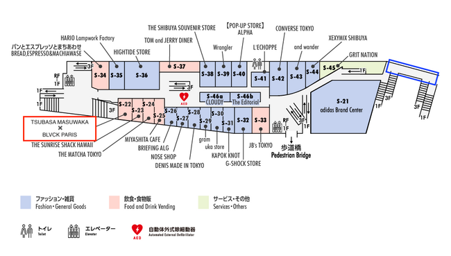 以下の地図「RAYARD MIYASHITA PARK South 2F」にて、左下赤枠が店舗位置、右上青枠がOPEN前10:00〜購入整理券配布場所です。