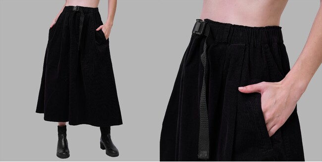 薄手のコーデュロイ生地でウエストもゴムにし、着心地よく作りました。ベルトで絞れるのでサイズも調整できます。ベルトにはTsubasa Masuwakaのオリジナルのロゴもついています。ニットやスエット、夏はタンクトップにも合います。男性の方は、コーデュロイパンツの上に重ねてはいても可愛いと思います。洗うほどに味が出ます。
