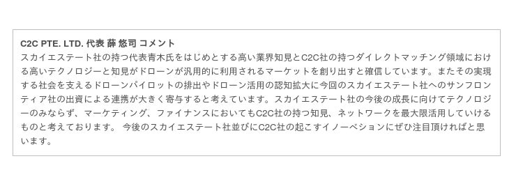 ドローンパイロットマッチングアプリ「SORAeMON」を展開するスカイエステート株式会社がサンフロンティア不動産株式会社より資金調達を実施。C2Cプラットフォームを活用したサービスでは4社目の資金調達