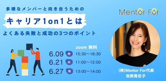 企業のDE&I(Diversity, Equity & Inclusion)推進を目的とした、社外メンターの育成・マッチングを行う株式会社Mentor For(東京都渋谷区・代表取締役:池原真佐子、以下、Mentor For)は、企業で働く管理職・リーダー層を対象とした「キャリア1on1」を学ぶe-learning学習プログラムの提供を2022年6月1日より開始いたします。これに合わせ、6月9日より3回に渡って「キャリア1on1」のポイントや失敗事例を学ぶセミナーを無料開催いたします。