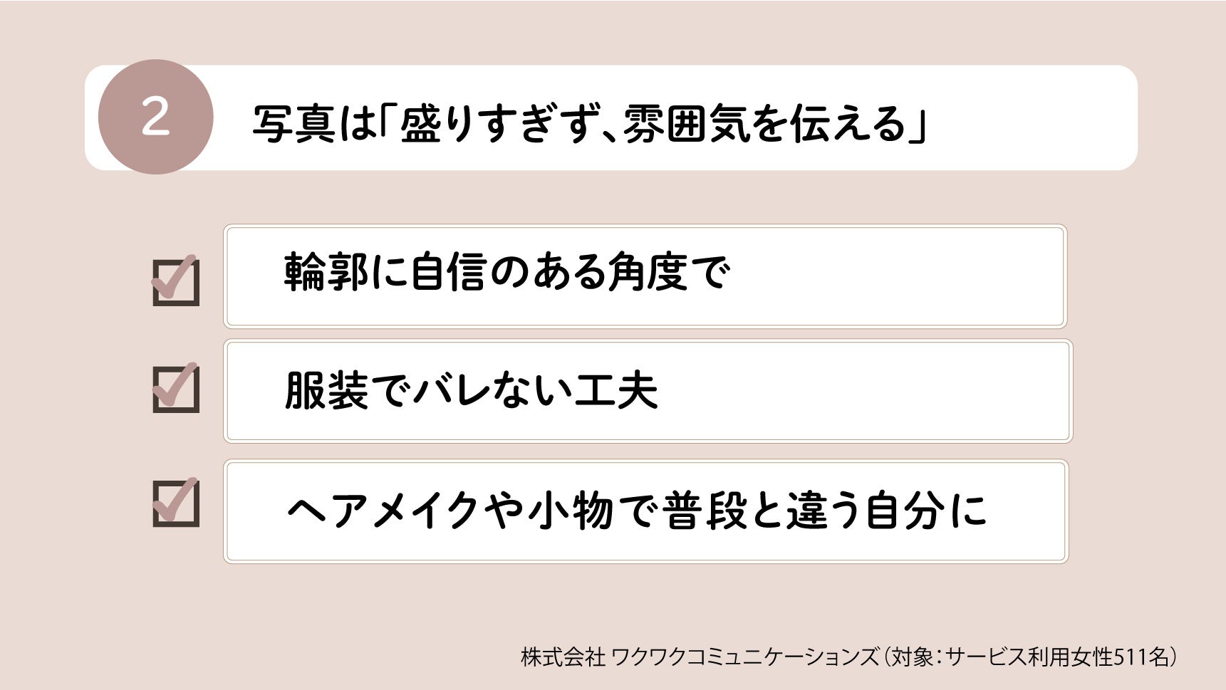 [画像4: https://prcdn.freetls.fastly.net/release_image/44869/17/44869-17-24a3b7f9b93e484264a8e75640b425ca-1721x969.jpg?width=536&quality=85%2C75&format=jpeg&auto=webp&fit=bounds&bg-color=fff ]設定する写真は自分をよく見せたい気持ちと、リアルさのバランスが鍵。成功している方々は、真正面からではなく、綺麗に見える角度や雰囲気が一番良く伝わる少し引きの写を選んでいるようです。