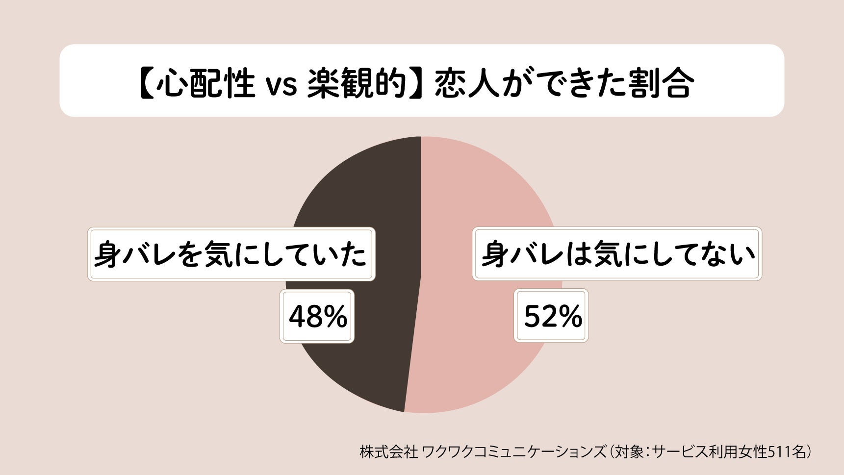 「身バレがとても不安/少し不安だった」と回答した方の中で恋人ができた割合が約48%だったのに対し、「あまり/全く不安はなかった」と回答した方では約52%。両者に大きな違いは見られませんでした。