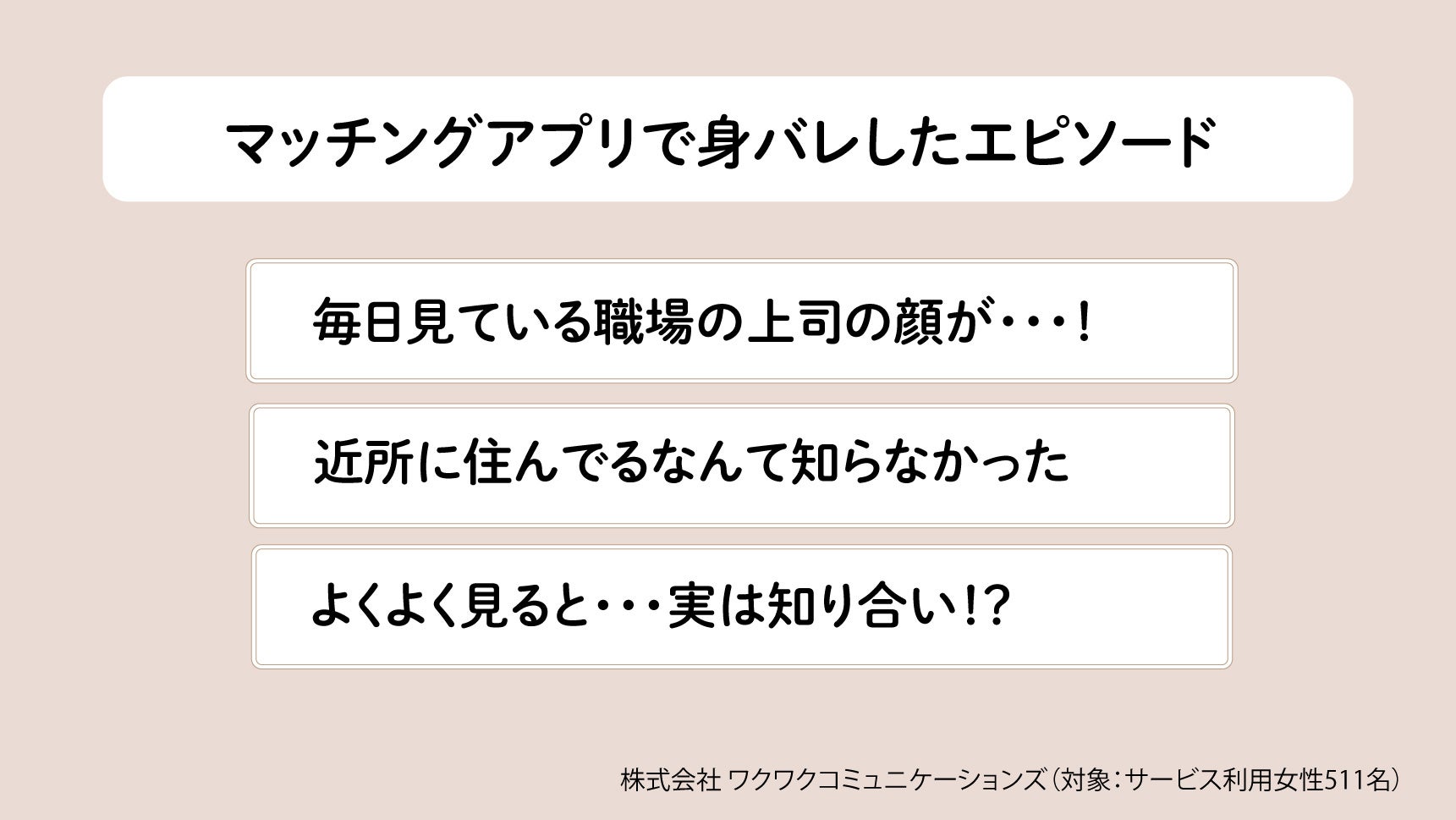 実は、アプリ利用者の半数以上も身バレに対し『とても不安だった』と答えています。日本最大級の恋愛マッチングサービス「ワクワクメール(https://550909.com/)(運営:株式会社 ワクワクコミュニケーションズ)」を利用している女性511人からのリアルなエピソードを大公開。