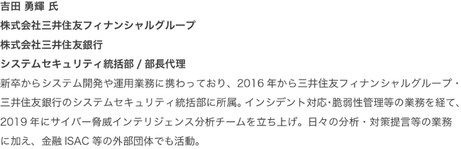 金融機関にてプロジェクトマネジメント、セキュリティ監視業務、脅威分析業務に携わった後、2022年より現職。主にグループ内SOCの展開・高度化やセキュリティソリューションの導入と展開、脅威インテリジェンスの活用に従事。