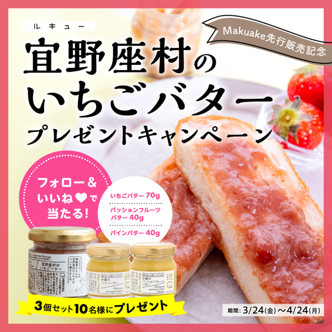 プロジェクト開始を記念し、琉Q公式Instagram(https://www.instagram.com/ruq__official/)にて宜野座村のいちごバター(サンプル)が当たるフォロー&いいね!キャンペーンを実施いたします。