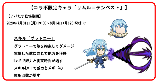 「コラボのアバたま」に限定キャラ「リムル=テンペスト」が登場!「リムル=テンペスト」 は初回当選でキャラタマゴとして入手できます。以降、当選回数に応じて「はじまりの服」「半袖衣装」「白シャツ姿」「魔王衣装」「神之怒」などのお着替えが手に入ります。また、剣士用コラボ限定お着替え「シュナなりきりセット」「ベニマルなりきりセット」、 アマゾネスの激レアお着替え「シオンセット」、ジャイアントサイの激レアお着替え「ランガ&ゴブタセット」も登場しますので、アバたまを割って、コラボ期間中にしか手に入らない限定キャラタマゴやアイテムを手に入れましょう!