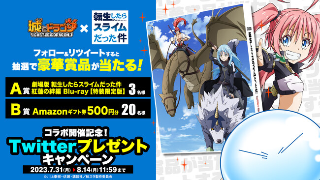 7月31日(月)より、コラボ開催を記念した「コラボ開催記念!Twitterプレゼントキャンペーン」を実施いたします。『城とドラゴン』公式Twitterアカウントをフォローし、対象ツイートをリツイートしていただいた方の中から抽選で、TVアニメ『転生したらスライムだった件』のBlu-rayやAmazonギフト券をプレゼントいたします。たくさんのご参加お待ちしております。