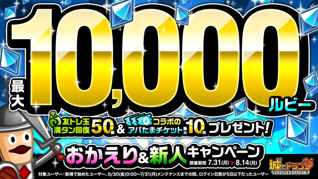 7月31日(月)より、対象ユーザーに最大10,000ルビーやコラボのアバたまチケット最大10枚などが贈られる「おかえり&新人キャンペーン」を開催いたします。