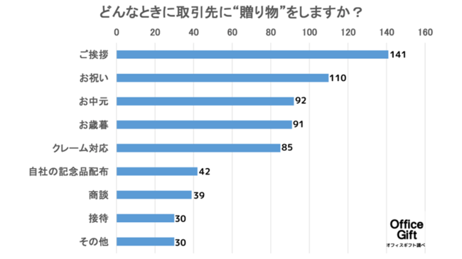 「どんなときに取引先に“贈り物”をしますか?」という質問に対して、「ご挨拶」を選んだ方が141名、「お祝い」が110名、「お中元」が92名で、「お歳暮」「クレーム対応」「自社の記念品配布」の順に続く結果となりました。