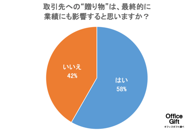 「取引先への“贈り物”は、最終的に業績にも影響すると思いますか?」という質問に対して、「はい」と回答した方は58%、「いいえ」と回答した方は42%でした。