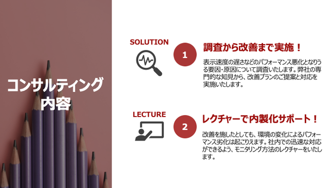 このような背景から、Tableauを利用したデータ分析のパフォーマンス状況にお困りの企業様向けに、原因を調査・改善・内製化が可能な「Tableauパフォーマンスコンサルティング」サービスをリリースいたしました。