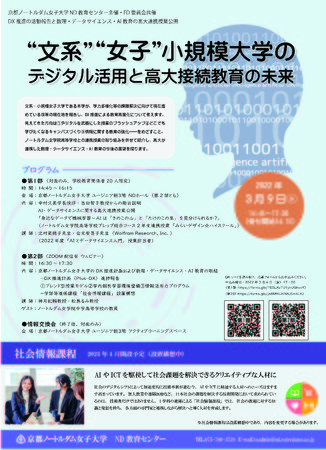 京都ノートルダム女子大学(学長:中村久美、所在地:京都府京都市左京区)は、3月9日にDX推進の活動報告と数理・データサイエンス・AI教育の高大連携授業公開イベント「“文系”“女子”小規模大学のデジタル活用と高大接続教育の未来」を開催します。