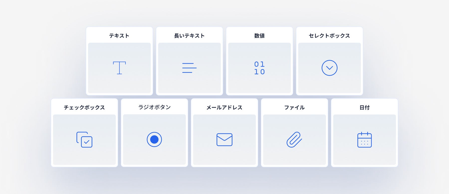 基本的なテキスト入力はもちろん、日付入力や画像・PDFファイルのアップロードにも対応しており、要件に応じて柔軟にフォームをつくることができます。