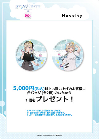 『夜のクラゲは泳げない feat. JELEEちゃん(はむねずこ) POP-UP SHOP』では、1会計毎に5,000円(税込)以上お買い上げのお客様に、57mm缶バッジ (全2種)を1個プレゼントいたします。