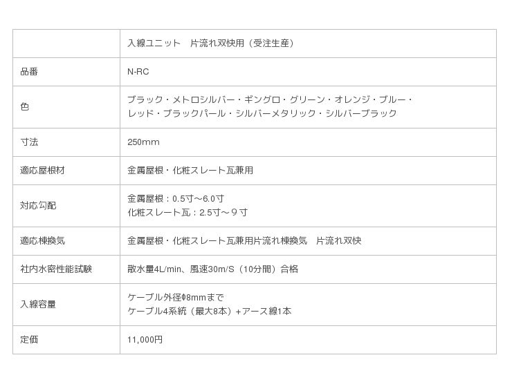 この困り事を解決する部材として、棟換気で培った技術を応用し、緩勾配の片流れ屋根においても屋根から入線出来る部材「入線ユニット片流れ双快」を開発しました。