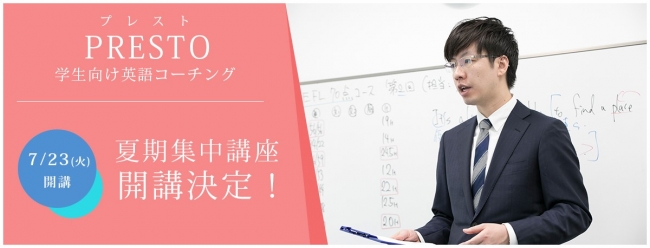 語学コーチングスクール「PRESENCE(プレゼンス)」(https://www.presence.jp/)は、18年間、大学生以上・社会人中心に結果を出し続けてきたプログラムをそのままに、Zoom(Web会議システム)を介して全国の中学生・高校生に向けた短期集中コース『PRESTO(プレスト)』を開校しました。2019年7月23日(火)より、TOEFL、TOEIC、英検の3つのコースの夏期講習がスタートします。