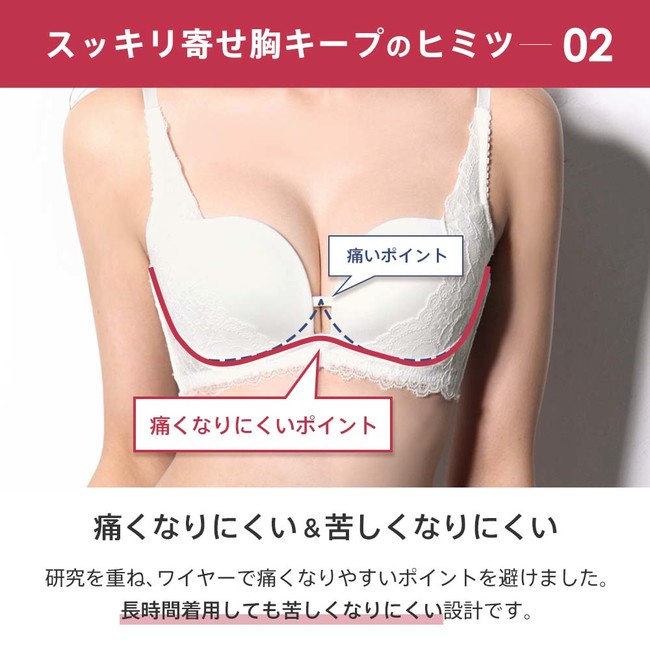 痛くなりにくいワイヤー&余分な脇肉をホールドする脇高設計のブラ。L字ワイヤーを採用し、長時間着用しても苦しくなりにくく、多くの方からご好評をいただき、シリーズ累計販売枚数600万枚※を突破致しました。