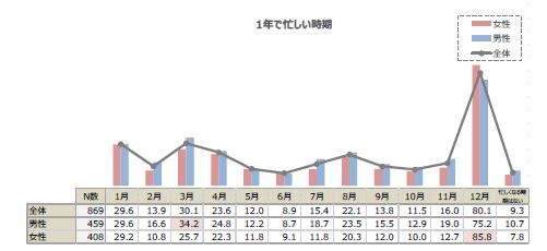 男女別でみると、男性より女性の方が忙しい時期として「12月」を選んだ人が10ポイントほど多い結果となりました。一方で男性は「3月」を選んだ人が女性より10ポイント多いことが分かりました。