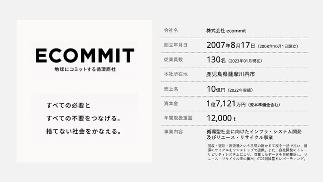 ものづくりで世界をリードしてきた日本だからこそ、次はものの循環の仕組みづくりで世界をリードする。そのためにも、ECOMMITは利便性を求めて発展してきた高度経済成長から、地球の存続を追求して発展する高度『循環』経済成長を生み出すリーディングカンパニーを目指してまいります。
