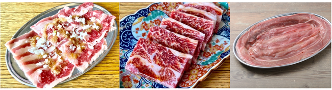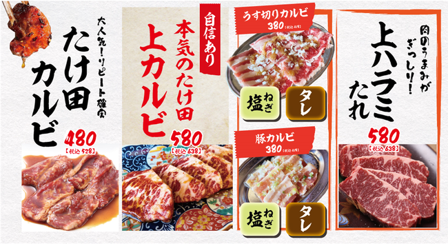 人気の肉メニュー 左上から:破格の「薄切りカルビ」380円(税込418円)、肉質No1「本気のたけ田 上カルビ」580円(税込638円)、味・ボリューム・価格を兼ね備えた人気の「なが〜いタン【豚】」380円(税込418円)
