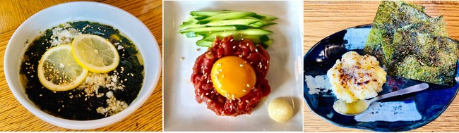 充実のサイドメニュー 左上から:和風出しが味の決め手である、新名物「黒冷麺」480円(税込528円)、人気の高い「さくらユッケ」780円(税込858円)、ビジュアルにもこだわった「焼肉屋の炙りチーズポテサラ」380円(税込418円)