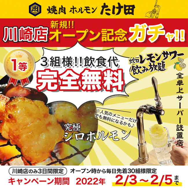 コロナ禍においても堅調な業績で推移している自社ブランド『焼肉ホルモンたけ田』を運営する、株式会社ミナモト(代表取締役:細田源太)は、同ブランド16店舗目、神奈川県2店舗目となる川崎店を2022年2月3日(土)にオープンする運びとなりました。同店ではブランド初の試みとなる「無料ガチャ」キャンペーンも同時開催いたします。