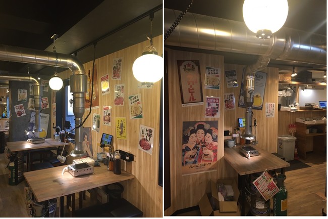 木目調の温かみのある店内には、壁一杯に『焼肉ホルモンたけ田』オリジナルPOPと昭和モダンポスターが新しさの中に、どこか懐かしい雰囲気を醸し出しています。