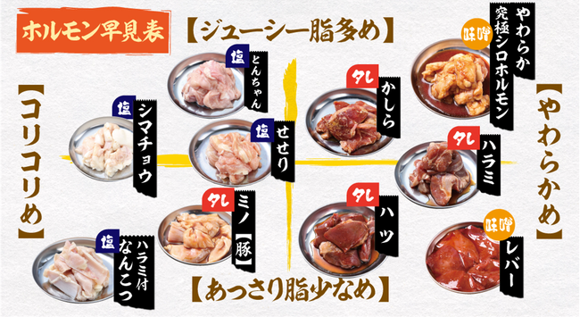 全国から産地を厳選し問屋から直接買付した新鮮な国産ホルモンを330円(税込363円)〜400円(税込440円)で提供しております。特製のホルモン早見表をご覧いただきながら、お好みに応じたホルモンをお選びくださいませ。