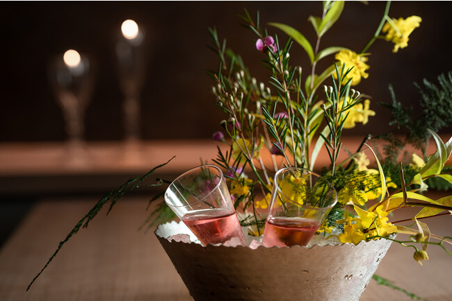 はつはなでは夕食の懐石料理を、ソムリエによるワインペアリングとともにご堪能いただけます。日本酒やワインに限らず特別なお茶などから、よりお食事が引き立つものをセレクトし、その場でアレンジしながらご提供いたします。