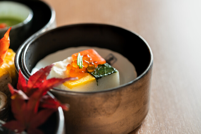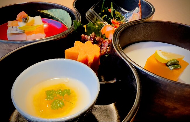 季節の食材を生かしたメニューとしては、蕪のムース コンソメジュレ(画像手前)。つるりとした喉越しで、蕪の甘みを上品に引き立たせるセルフィーユがワンポイントに添えられます。また、紅葉真丈焼き(画面中央)、南瓜檸檬寄せ(画面右)など目や舌で秋らしさを感じられる料理が盛り込まれます。