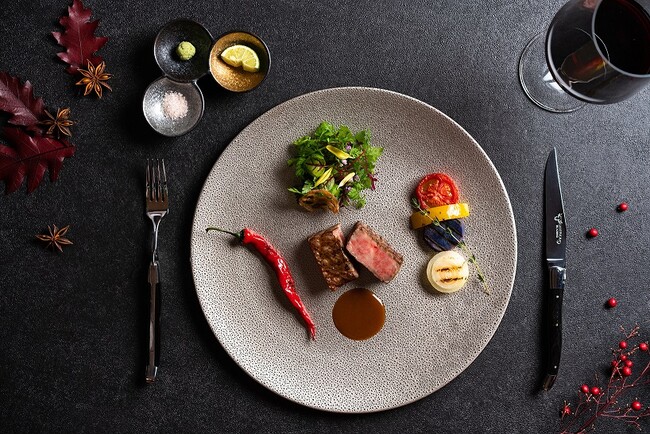 新登場コースの肉料理は、ベルナルドの器に盛られた松阪牛ロースの炭火焼き。ラギオールのナイフ・フォークでお召し上がりいただきます。合わせるソースはさっぱりとしたセロリと茗荷のラビゴットソースです。