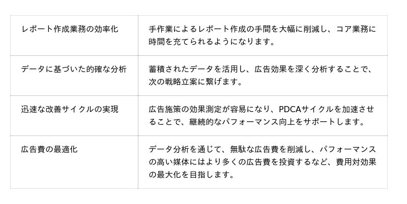 [画像3: https://prcdn.freetls.fastly.net/release_image/99819/18/99819-18-50bab9fc1b7b30e295844d1f28530383-869x452.png?width=536&quality=85%2C75&format=jpeg&auto=webp&fit=bounds&bg-color=fff ]本プランは、Googleのアクセス解析ツール「GA4(Google Analytics 4)」と、さまざまなデータをグラフや表で可視化できる「Google Looker Studio」を活用し、Web広告の成果を分かりやすくレポート化するサービスです。